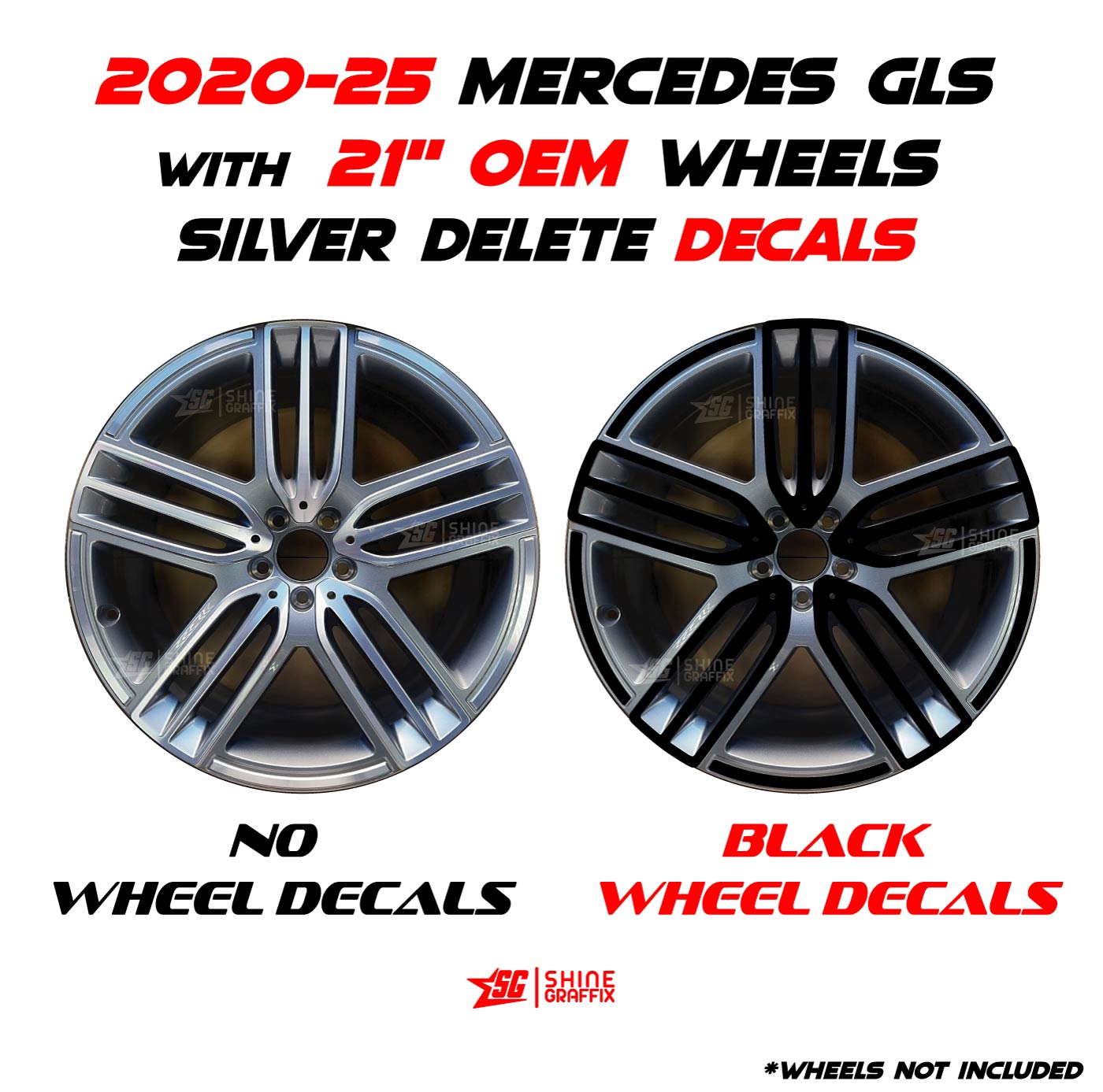 Mercedes GLS 450 Black Wheel decals view with 21″ OEM wheels silver delete