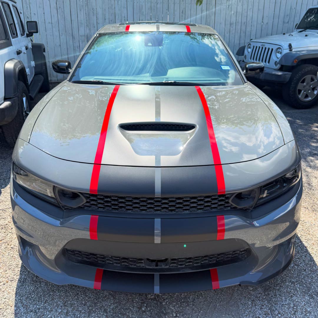 Dodge Charger Scatpack Hellcat Matte black racing stripes with wide pinstripes Red Front Hood view